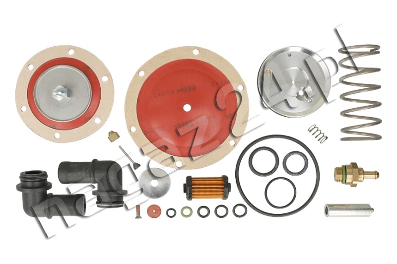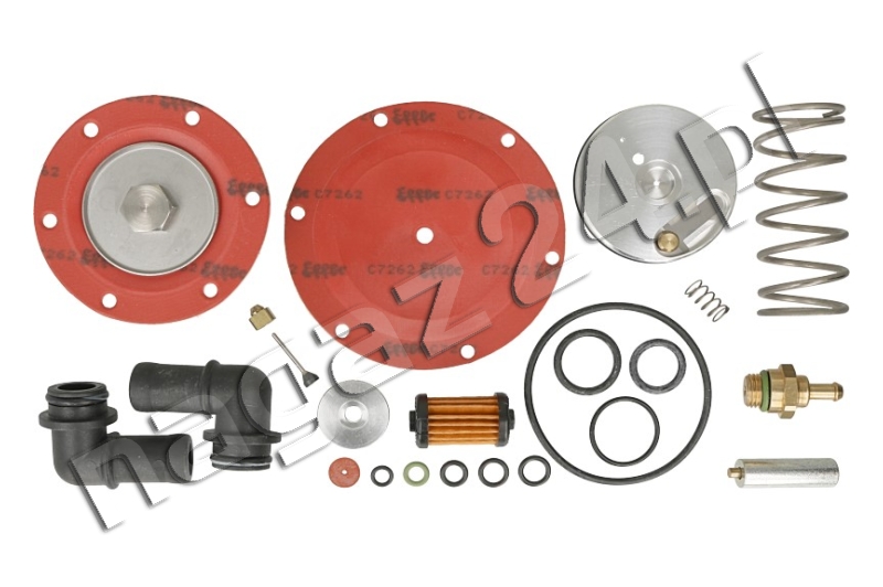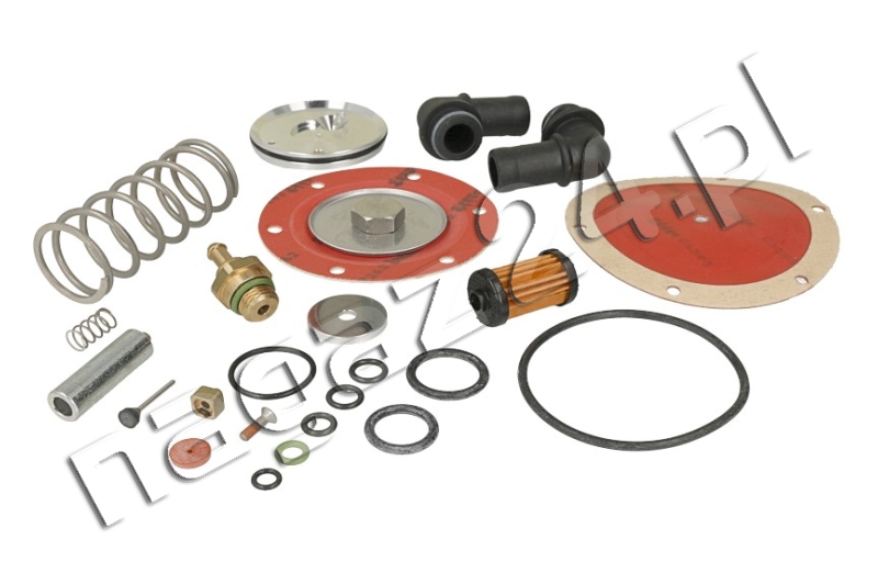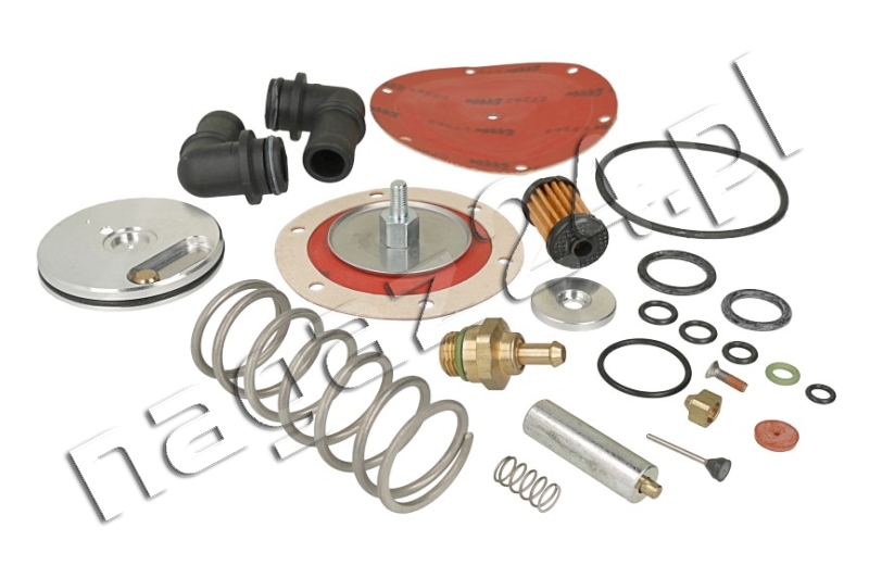 Spare part for:The original full reducer repair kit includes: two diaphragms, a set of O-rings, two springs, two elbows with sealing, valve piston with accessories, replaceable plates, gas solenoid valve filtering element.