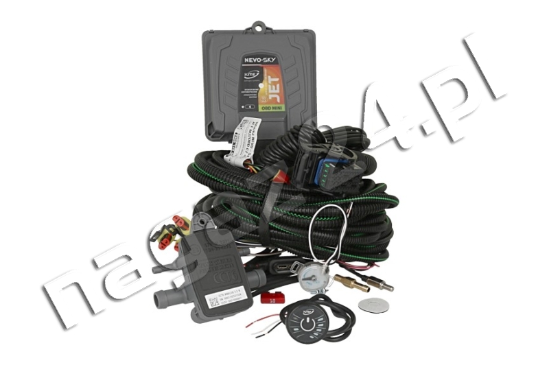 W skład uniwersalnego zestawu montażowego elektroniki samochodowej instalacji gazowej IV generacji (sekwencyjnego wtrysku LPG w fazie lotnej) KME NEVO-SKY JET OBD MINI 4 cylindry elektronika DG7 5,5 bar wchodzą: