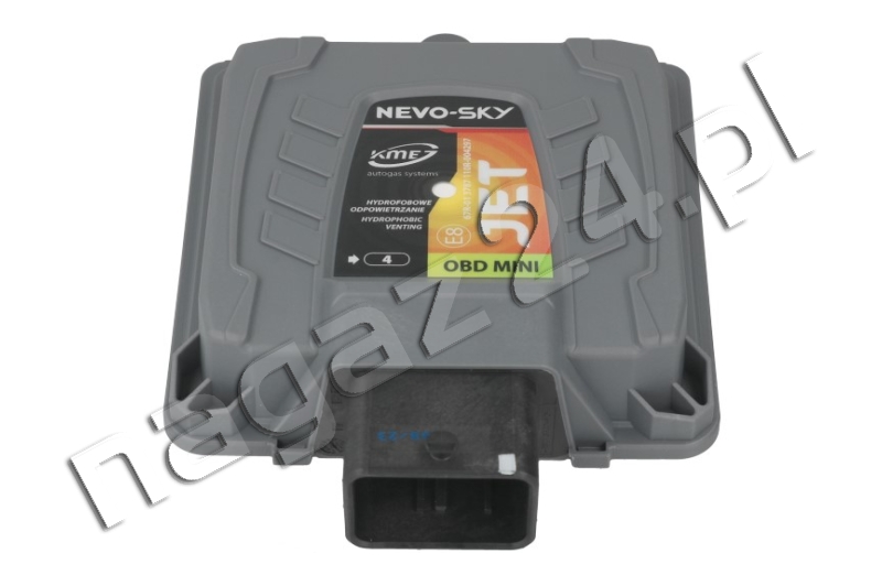 KME NEVO-SKY JET OBD MINI 4 cylindry elektronika DG8 5,5 bara – uniwersalny zestaw montażowy elektroniki samochodowej instalacji gazowej IV generacji (sekwencyjnego wtrysku LPG w fazie lotnej) NEVO-SKY JET OBD MINI firmy KME, przeznaczony do konwersji na zasilanie LPG samochodów wyposażonych w 3- i 4-cylindrowe jednostki napędowe z pośrednim wtryskiem benzyny. Sterownik NEVO-SKY JET OBD MINI ma możliwość współpracy z układem OBD samochodu.