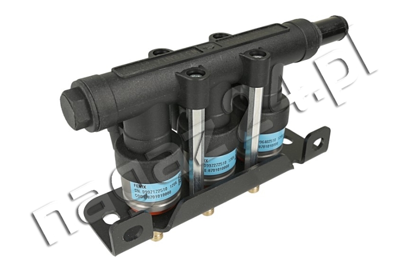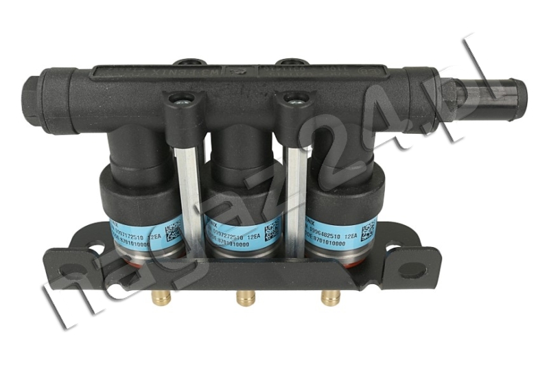 Listwa wtryskiwaczy gazowych KME FENIX BLUE 3 cylindry konfekcja – 3-sekcyjna listwa wtryskiwaczy gazowych wykorzystująca wtryskiwacze FENIX firmy KME osadzone w wykonanym w tworzywa sztucznego, dedykowanym korpusie, szynie, znajdująca zastosowanie w samochodowych instalacjach gazowych IV generacji (sekwencyjnych wtryskach gazu w fazie lotnej) także do silników z bezpośrednim wtryskiem benzyny.